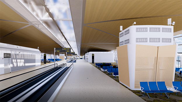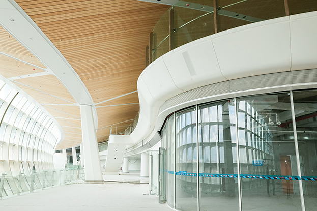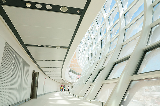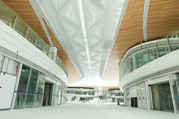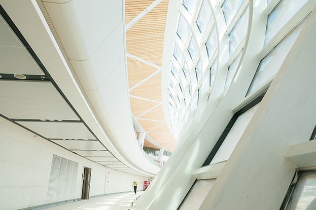 深圳機(jī)場衛(wèi)星廳建筑面積23萬多平方米,由中央、東南、東北、西南和西北五個指廊組成,分為地上四層、地下一層。作為唯一參與精裝修的民營企業(yè),中裝建設(shè)主要負(fù)責(zé)深圳機(jī)場衛(wèi)星廳2-3層西南、西北指廊,西雙子星廣場的精裝修工程。