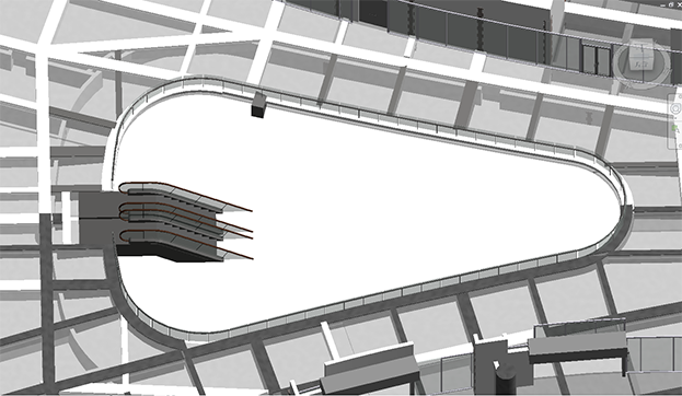 ▲鏤空區(qū)域,雙曲面檐口通過BIM模型演示與現(xiàn)場定位,模型下單