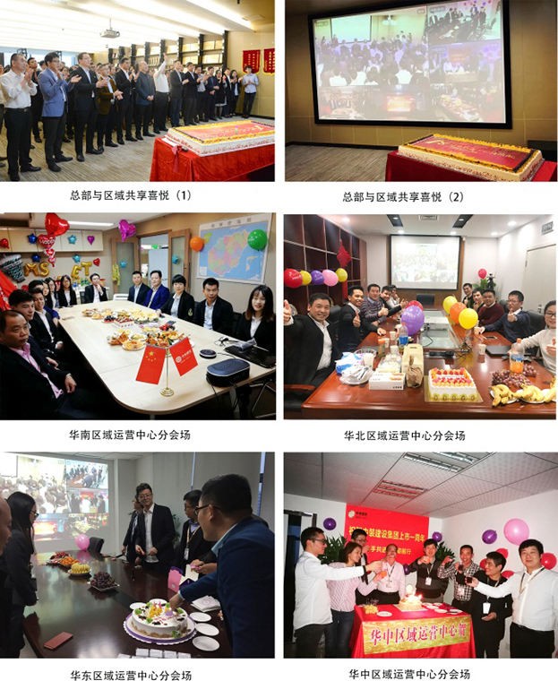 遠(yuǎn)程共享,歡喜同賀。中裝建設(shè)華南區(qū)域運(yùn)營(yíng)中心、華北區(qū)域運(yùn)營(yíng)中心、華中區(qū)域運(yùn)營(yíng)中心、華東區(qū)域運(yùn)營(yíng)中心、青島分公司等分會(huì)場(chǎng)與集團(tuán)總部遠(yuǎn)程視頻、共同慶祝中裝建設(shè)上市一周年。